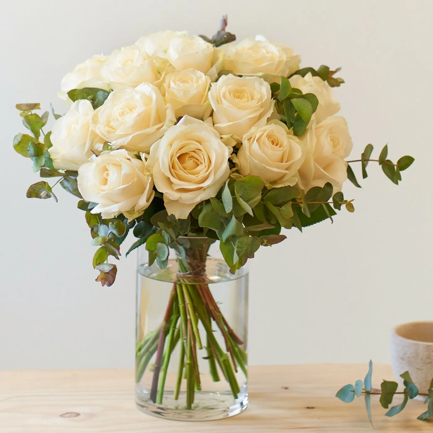 R0107Bukiet z 15 białych róż i zieleni dekoracyjnej.