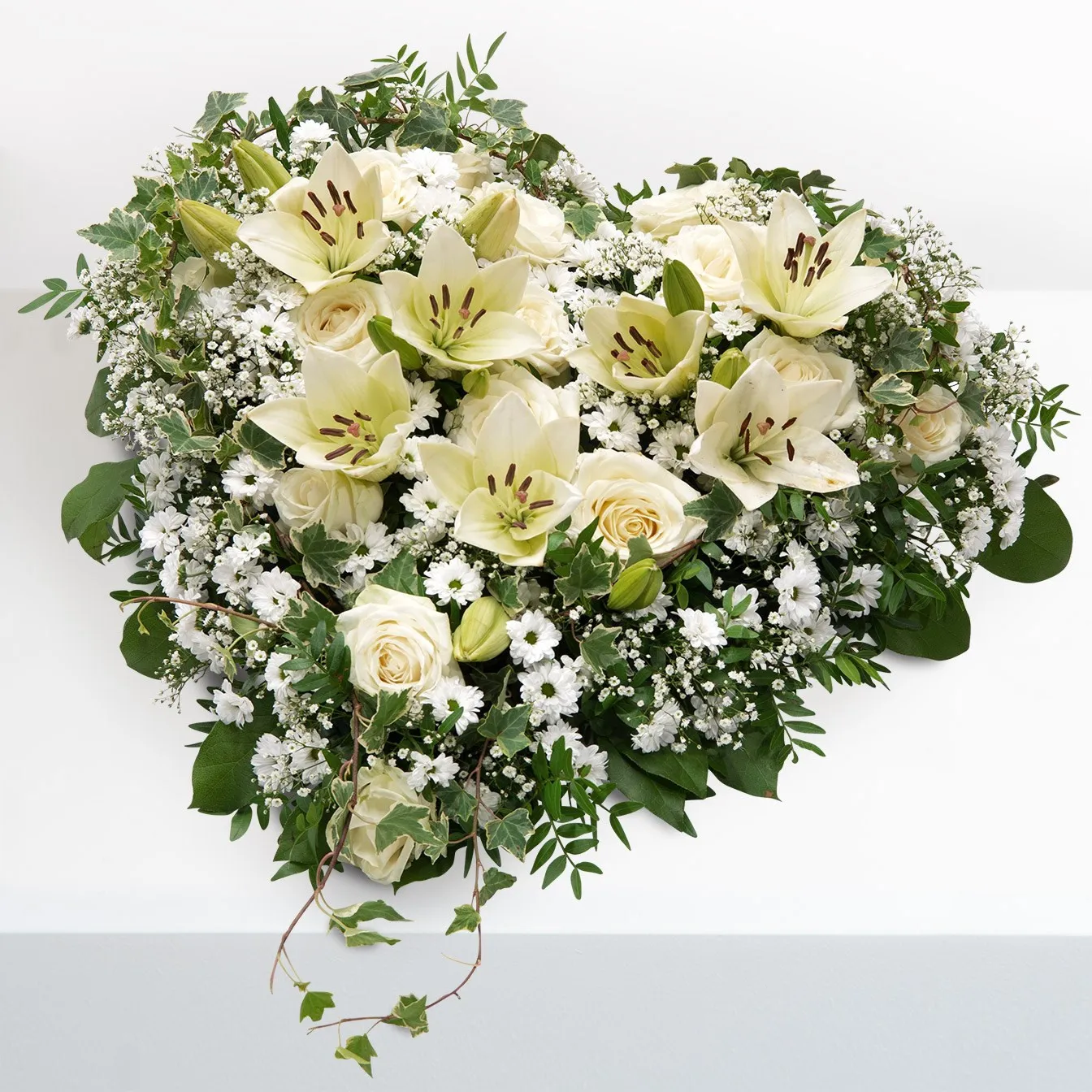 Heart-shaped funeral arrangement in white-green with roses, santini, gypsophila and lilies. Additional green as pistachio, shallon, ivy and asparagus is also used.Dostępność: 01.01 - 31.12