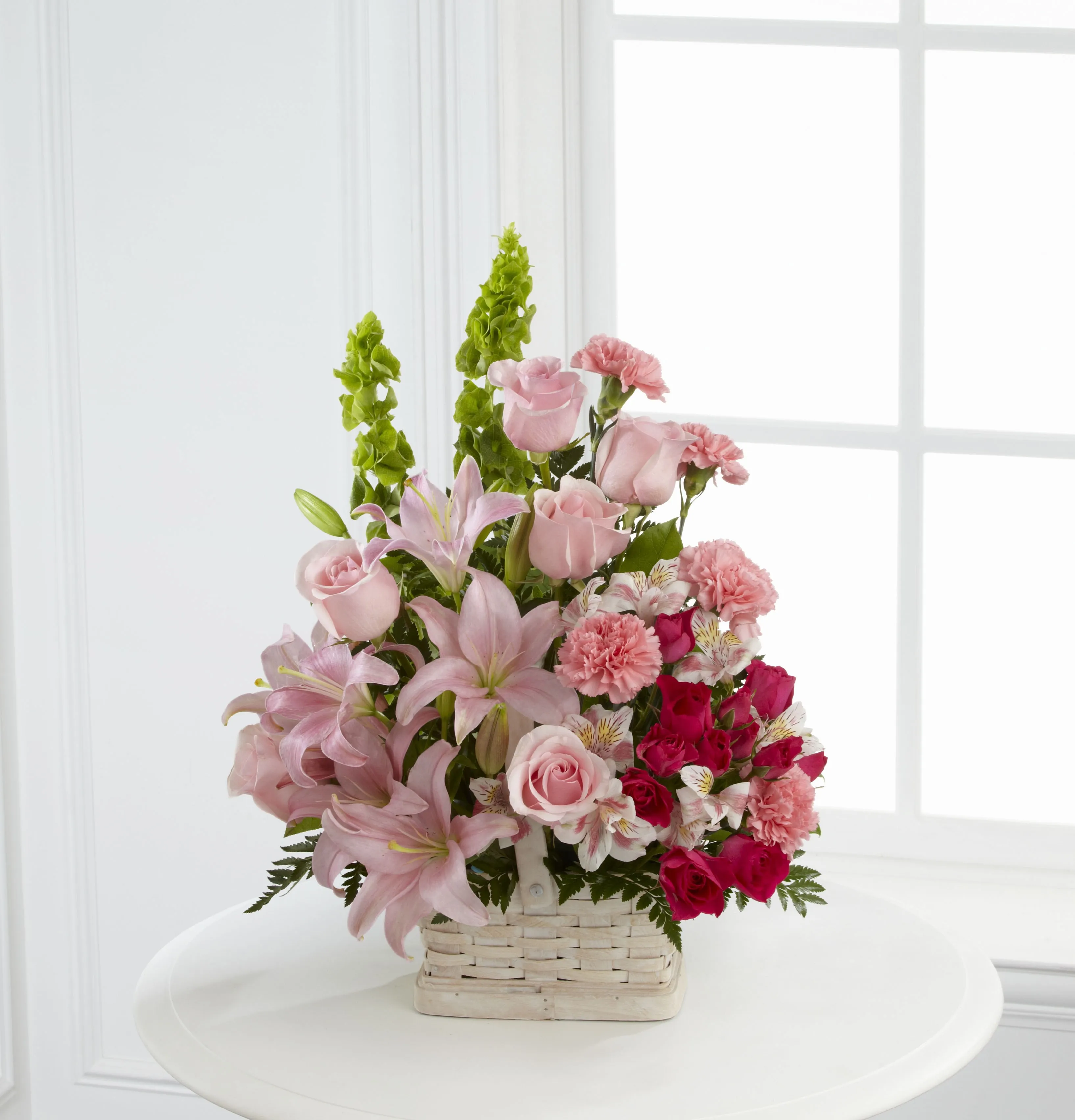 Różowe róże, lilie azjatyckie i lilie peruwiańskie są podkreślone łodygami goździków w kolorze fuksji i róż w sprayu, a także Bells of Ireland i różnorodną zielenią. Umieszczona w białym koszu z wiórów drzewnych, ta pełna wdzięku aranżacja tworzy wyjątkowy sposób na ofiarowanie pokoju i współczucia. Aranżacja i dostawa w Kolumbii.