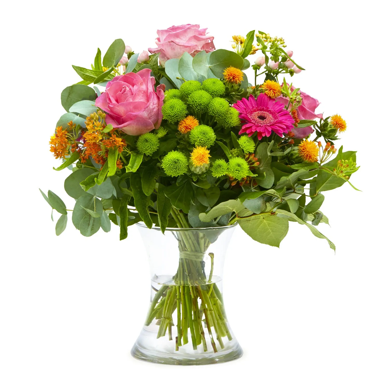 Pozwól sobie lub swoim przyjaciołom i bliskim cieszyć się harmonią i pięknem jesieni wyrażonej bukietem pełnym róż lawinowych, gerber, santini i delikatnego różowego Hypericum.