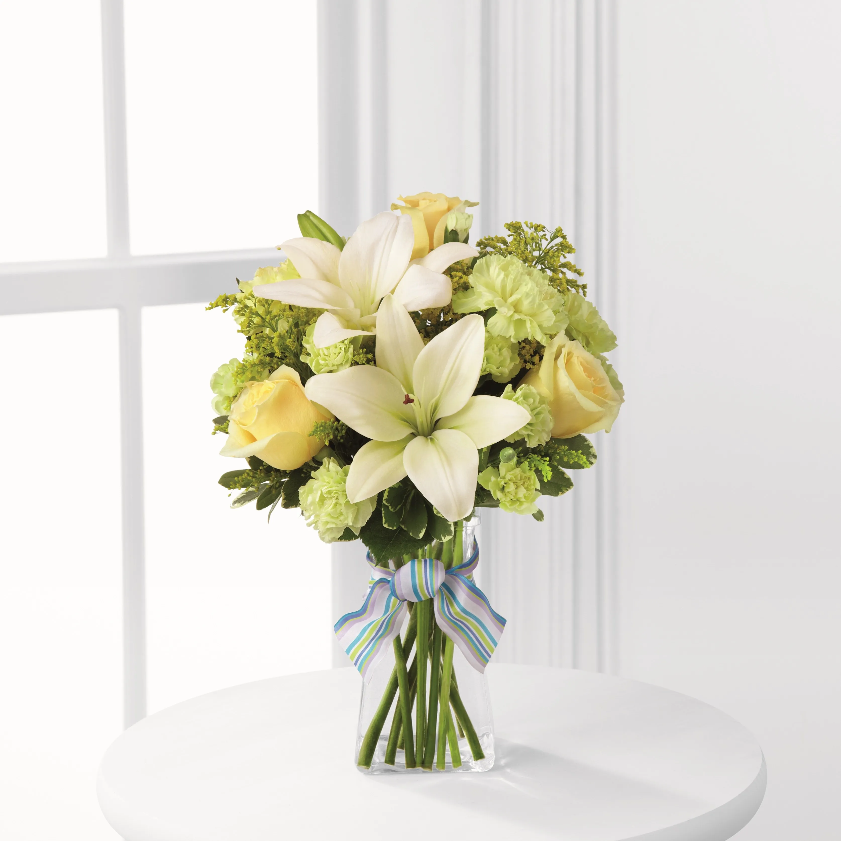 Bukiet Boy Oh Boy wykorzystuje róże i lilie azjatyckie, aby przesłać jasne i słoneczne gratulacje z okazji narodzin nowego chłopca! Żółte róże i goździki są połączone z jasnozielonymi mini goździkami, białymi liliami azjatyckimi, żółtymi liliowcami i bujną zielenią, pięknie ułożonymi w kwadratowym wazonie z przezroczystego szkła. Podkreślone niebieską i lawendową wstążką, profesjonalnie zaaranżowane i dostarczone przez lokalną kwiaciarnię w Meksyku.Dostępność: 01.01 - 07.05, 10.05 - 31.12