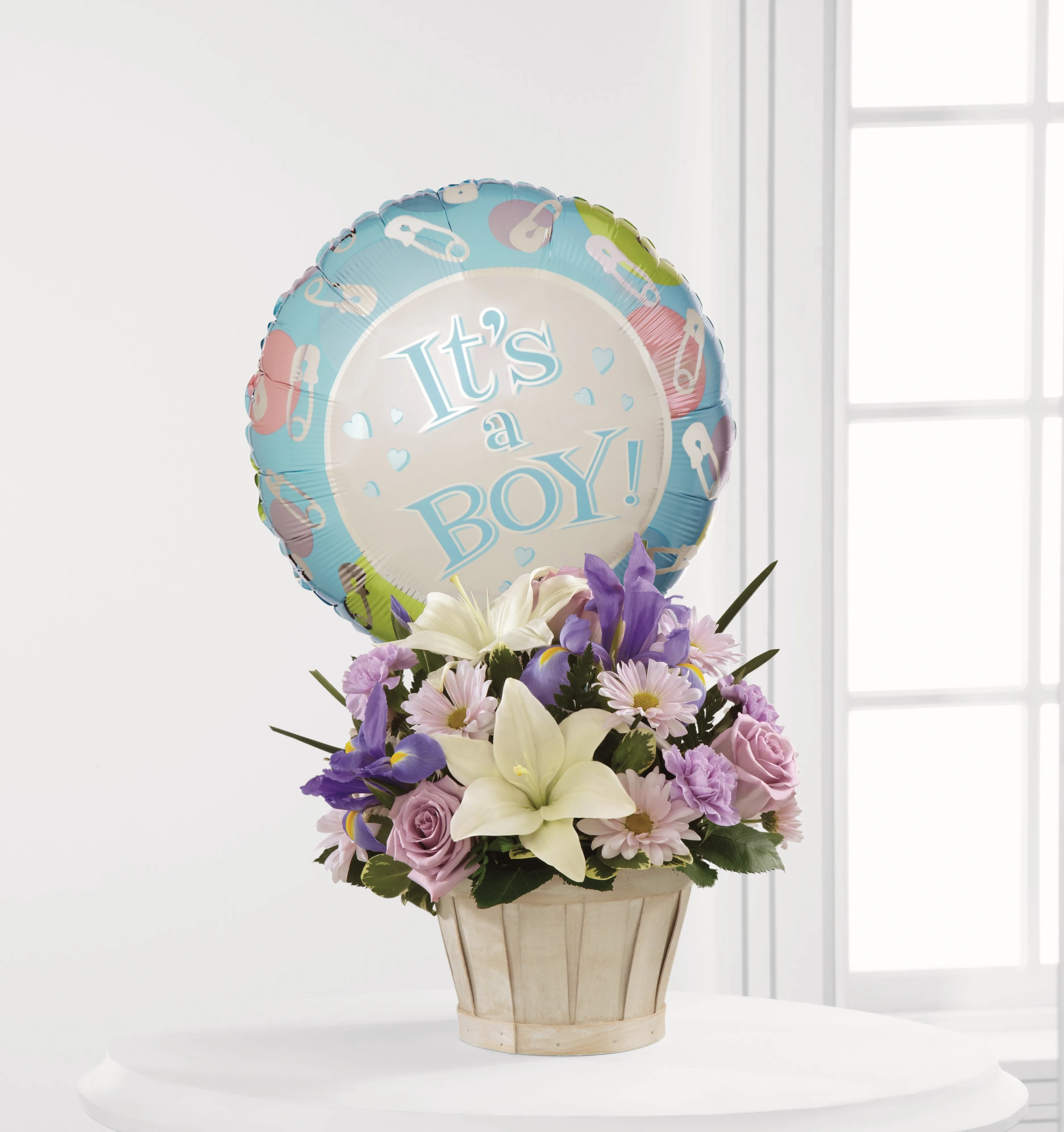 Kwitnący słodką miłością, aby pogratulować nowej rodzinie ich ukochanego chłopca Prezentowany z balonem Mylar deklarującym, że jest to chłopiec. Tylko świeże i piękne rośliny i kwiaty wybrane lokalnie przez kwiaciarnię w Meksyku.