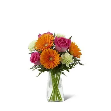 The Pure Bliss Bouquet is a blooming expression of happiness and joy set to brighten any day! Hot pink roses, orange gerbera daisies, light green carnations and lush greens are perfectly arranged in a clear gathered square vase to send a warm and cheerful sentiment to your special recipient.