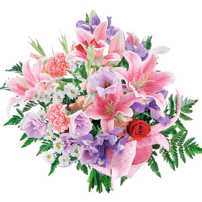 lilia, santini, goździk, róża, eustoma, irys, paproć szwedzka, wstążka
