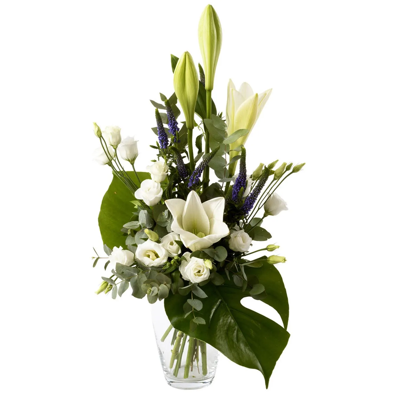 A beautiful high bouquet for mourning with white lilies and eustomas.