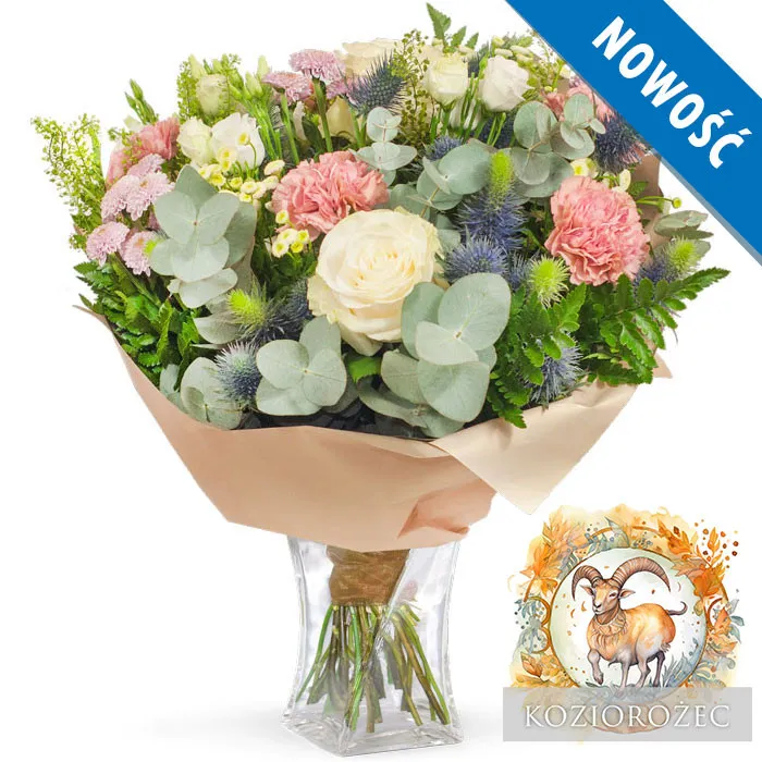 Bukiet dla Koziorożca - Siła, Ambicja i Szlachetna ElegancjaKoziorożec (22 grudnia - 19 stycznia) to dziesiąty znak zodiaku. Ten majestatyczny bukiet został stworzony z myślą o osobach urodzonych pod tym znakiem. Jego imponująca kompozycja odzwierciedla siłę, ambicję i szlachetną elegancję, które są charakterystyczne dla tego znaku.Jednym z głównych składników bukietu są goździki, które symbolizują siłę, wtrwałość i determinację Koziorożców.Ten imponujący bukiet jest hołdem dla potężnej i ambitnej osobowości Koziorożca. Niech przypomina o ich zdolności do osiągania celów, o pięknie równowagi między siłą a delikatnością oraz o szlachetności i majestatyczności, które czynią je tak wyjątkowymi.Dostępność: Cały rok