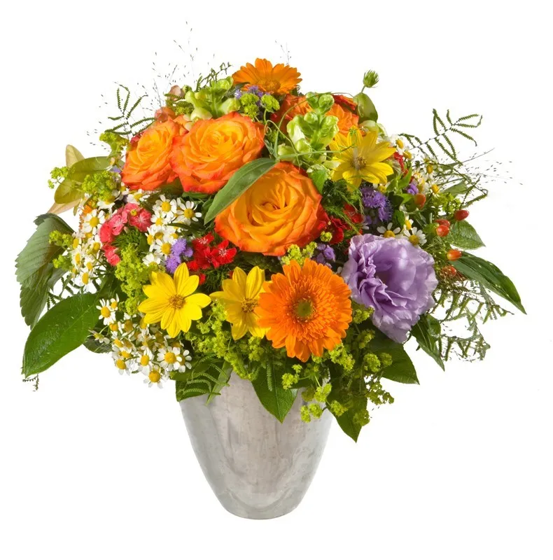 Niezwykle kolorowy i radosny bukiet, który może wnieść wiele radości do życia osoby, której pragniesz go podarować. Połączenie róż, gerber oraz sezonowych dodatków otulonych liśćmi dekoracyjnymi z dodatkiem ozdobnych traw to strzał w dziesiątkę! Taka kompozycja to idealny prezent z okazji urodzin bądź rocznicy, jednak świetnie sprawdzi się również jako podarunek bez okazji, który wyrazi więcej niż można przekazać za pomocą słów. Jeśli nie możesz podarować go osobiście to dzięki dostawie Poczty Kwiatowej® w Szwajcarii możesz go przesłać komu tylko zechcesz.