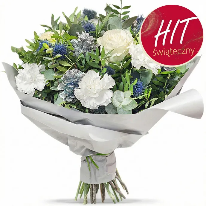 Wyjątkowy prezent jest zarówno pięknym gestem i miłą niespodzianką. Nie jest zatem dziwne, że kwiaty to najczęściej wybierany upominek na różne okazje. Szczególnie w czasie jesienno-zimowym i świątecznym lubi sprawiać bliskim wiele radości. Poczta Kwiatowa® stworzyła nowy bukiet, który idealnie sprawdzi się jako podarunek właśnie w tym okresie - Bukiet Mroźny. Bukiet mroźny to piękna kompozycja ze świeżych kwiatów z dodatkiem srebrnych szyszek. Cała kompozycja jest tworzona w kolorystyce biało-niebieskiej. Kwiaty są odpowiednio zabezpieczone, dlatego trafią do adresata w stanie idealnym.Produkt doręczany kurierem w eleganckim i bezpiecznym opakowaniu. Dostawa możliwa już na następny dzień!Zaskocz najbliższych i podaruj im nie tylko uśmiech!Zobacz więcej podobnych produktów tutaj: BOŻE NARODZENIE