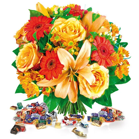 róża, gerbera, santini, lilia, hiperikum, zieleń dekoracyjna, wstążka, 1 kg cukierków