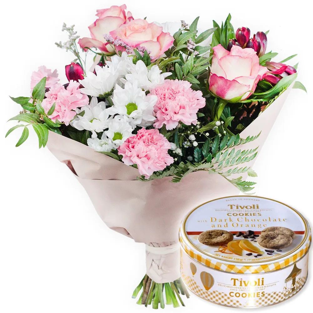 Szukasz prezentu, który łączy elegancję z przyjemnością? Bukiet Pastelowy z ciastkami to niezwykła kompozycja, która zachwyca delikatnością kolorów i dołączonym słodkim akcentem – puszką ciastek Jacobsens ozdobioną wizerunkiem róży.