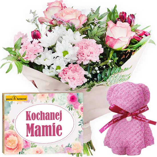 Bukiet pastelowy z misiem i bombonierką to wyjątkowy prezent stworzony z myślą o Dniu Matki. Subtelne margaretki, romantyczne róże, goździki i alstromerie w pastelowych barwach, uzupełnione delikatną gipsówką, tworzą harmonijną kompozycję pełną wdzięku. Uroczy ręczniczek złożony w formie misia symbolizuje troskę i ciepło, a elegancka bombonierka dodaje całości nuty słodkiej przyjemności. To prezent, który wzruszy każdą mamę.