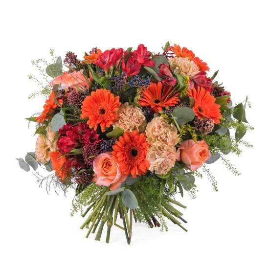 Naszą propozycją jest przedstawiona na zdjęciu obok kompozycja w ciepłych kolorach. Pomarańczowy to kolor symbolizujący siłę, energię i wytrwałość, zatem będzie doskonale pasował do okazji. Znaleźć tu można między innymi róże, gerbery i goździki, otoczone zielonymi liśćmi.