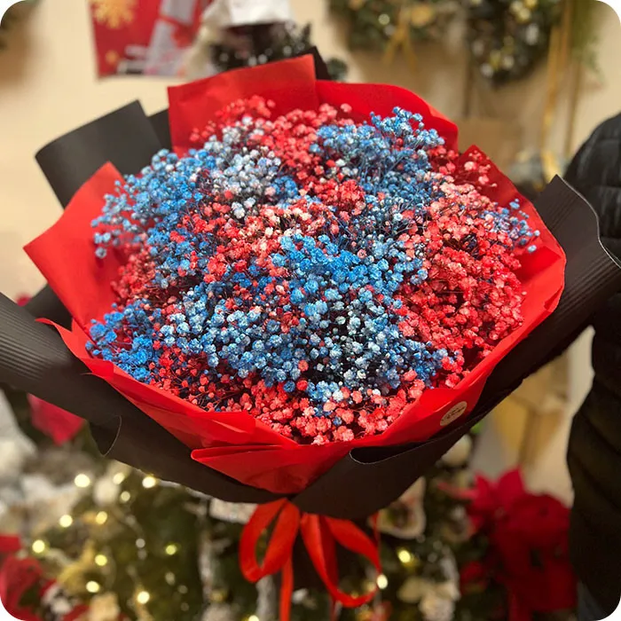 czerwona gipsówka, niebieska gipsówka, papier dekoracyjny, wstążka