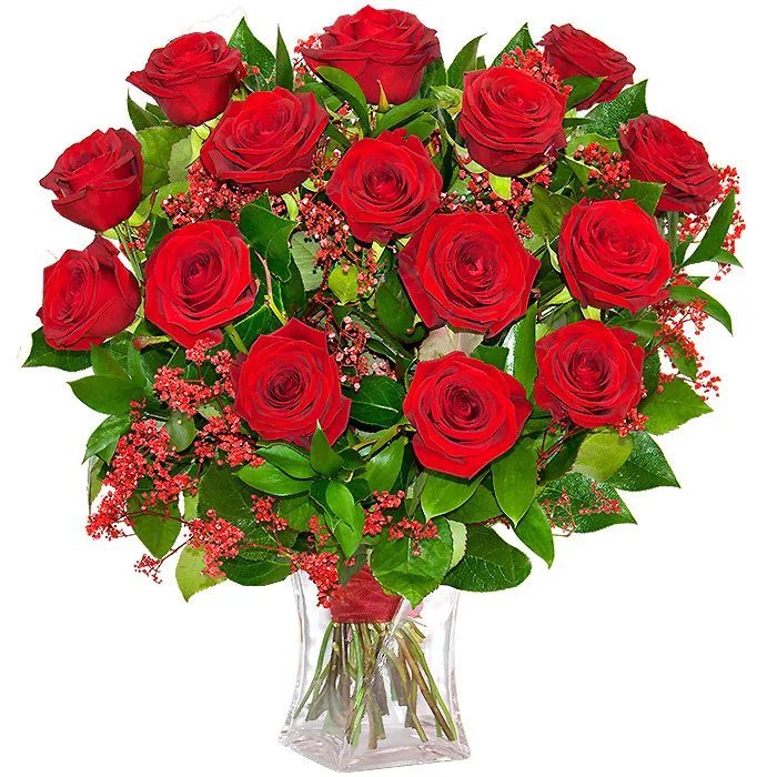 15 róż, gipsówka, wazon, zieleń dekoracyjna