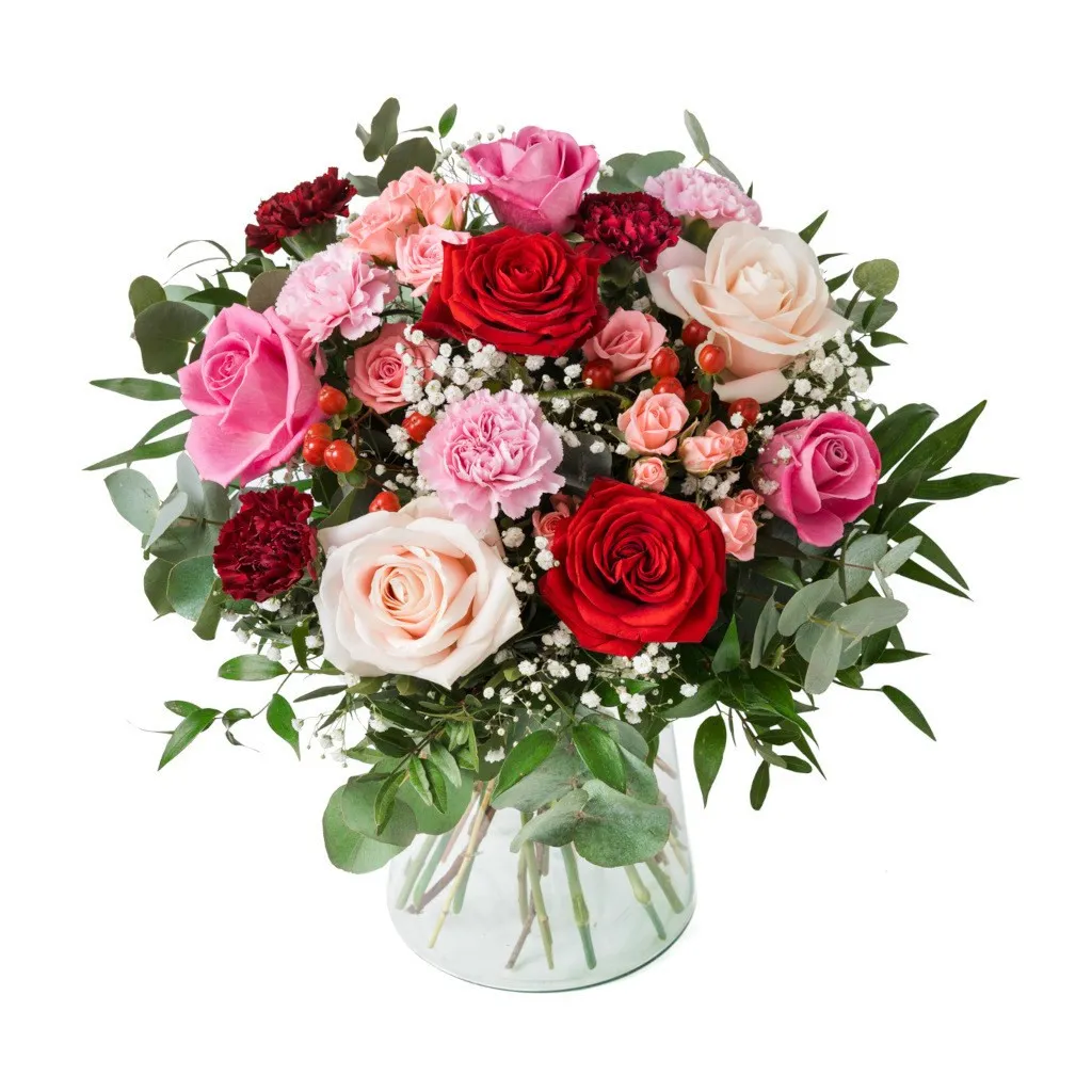 Wspaniały i efektowny bukiet w pięknych odcieniach czerwieni z dodatkiem zieleni. To doskonały wybór, gdy naprawdę chcesz oczarować ukochaną osobę romantycznym gestem. Wazon nie wchodzi w skład zestawu.