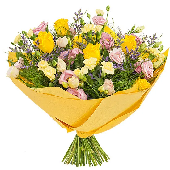 Skład: Eustomy, róże żółte, goździki, limonium, zieleń dekoracyjna, kryza