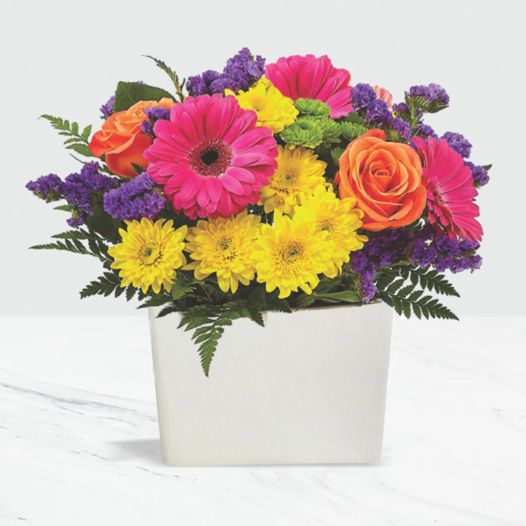 Gorące różowe gerbery i pomarańczowe róże zajmują centralne miejsce w nowoczesnym kwadratowym pudełku. Ta niezapomniana kompozycja ze świeżych kwiatów to zabawny i świąteczny prezent na wiele okazji.