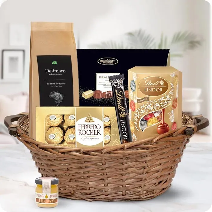 Aksamitne praliny Lindt i Ferrero Rocher rozpieszczą podniebienie, a praliny Excelcium Black dodadzą całości nuty elegancji. Słodycz doskonale dopełni aromatyczny miód lipowy zamknięty w ozdobnej szkatułce, a smakowitą harmonię uzupełni intensywna czekolada gorzka Lindor Dark Stick. Całość wieńczy wykwintna kawa ziarnista Delimaro™, której głęboki aromat i aksamitny smak nadadzą zestawowi wyjątkowego charakteru i podkreślą jego ekskluzywny styl.
