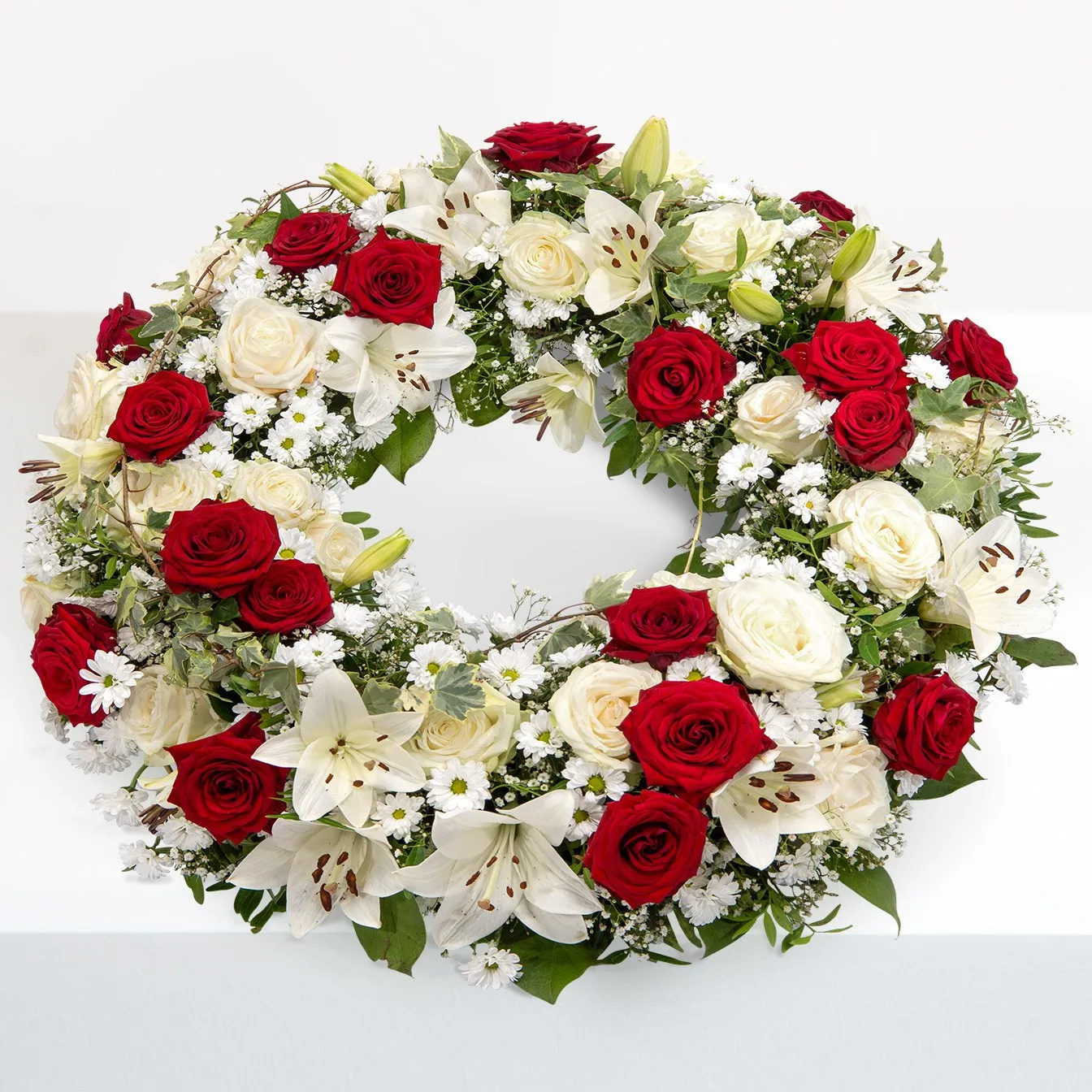 Circular funeral wreath in red-white with roses, santini, gypsophila and lilies. Additional green as pistachio, shallon and ivy is also used.