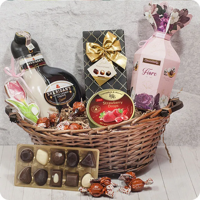 Prezent dla mamy, przyjaciółki, babci? Długo i szczęśliwie to kosz prezentowy z oferty Poczty Kwiatowej®, który świetnie sprawdzi się jako upominek dla bliskiej kobiety! Najwyższej jakości produkty, które zostały starannie ułożone w białym koszyku z pewnością zaskoczą i zachwycą. Odbiorczyni będzie mogła spróbować słodkiego pierniczka, landrynek o smaku truskawki i śmietanki, czekoladowych pralinek i cukierków oraz likieru Sheridan's.