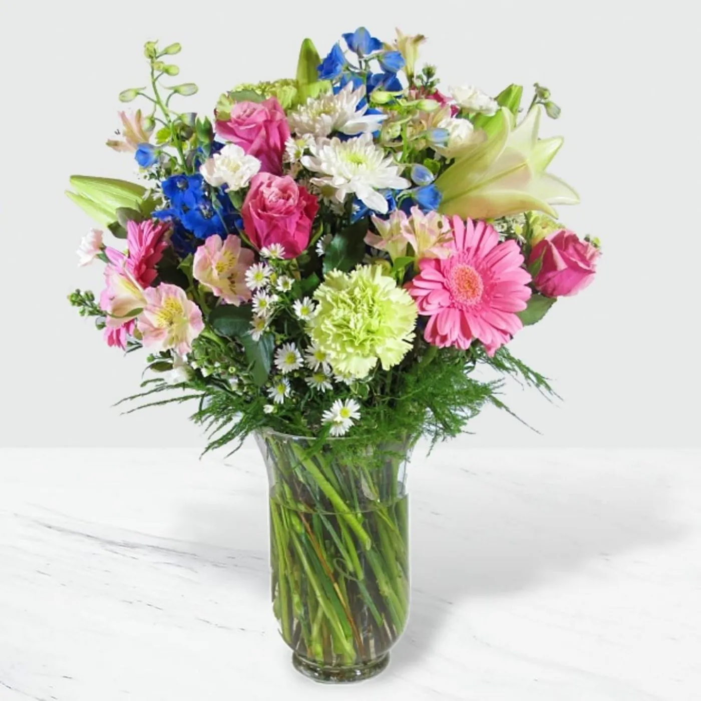 Poczuj tchnienie wiosny! Ta kolorowa kompozycja sprawia, że uśmiech sam pojawia się na twarzy. W eleganckim wazonie wykonanym ze szkła umieszczono delikatne kwiaty, takie jak klasyczne róże czy gerbery, a także dorodne lilie oraz drobne goździki i stokrotki. Całości dopełnia bujna zielenina.Chciałbyś, żeby w sercu bliskiej Tobie osoby także zagościła ta piękna pora roku? Nic prostszego, jedyne co musisz zrobić, to wysłać kwiaty prosto do Republiki Południowej Afryki.W ten sposób okażesz swoją bliskość swojej ukochanej mamie, siostrze lub przyjaciółce i pokażesz, że bardzo Tobie na niej zależy, pomimo faktu, iż od pewnego czasu dzielą Was tysiące kilometrów.Skorzystaj z usług kwiaciarni internetowej Poczta Kwiatowa® Republika Południowej Afryki, a możesz być pewien, że nasz kurier dostarczy wybrany przez Ciebie bukiet do bliskiej osoby na czas.