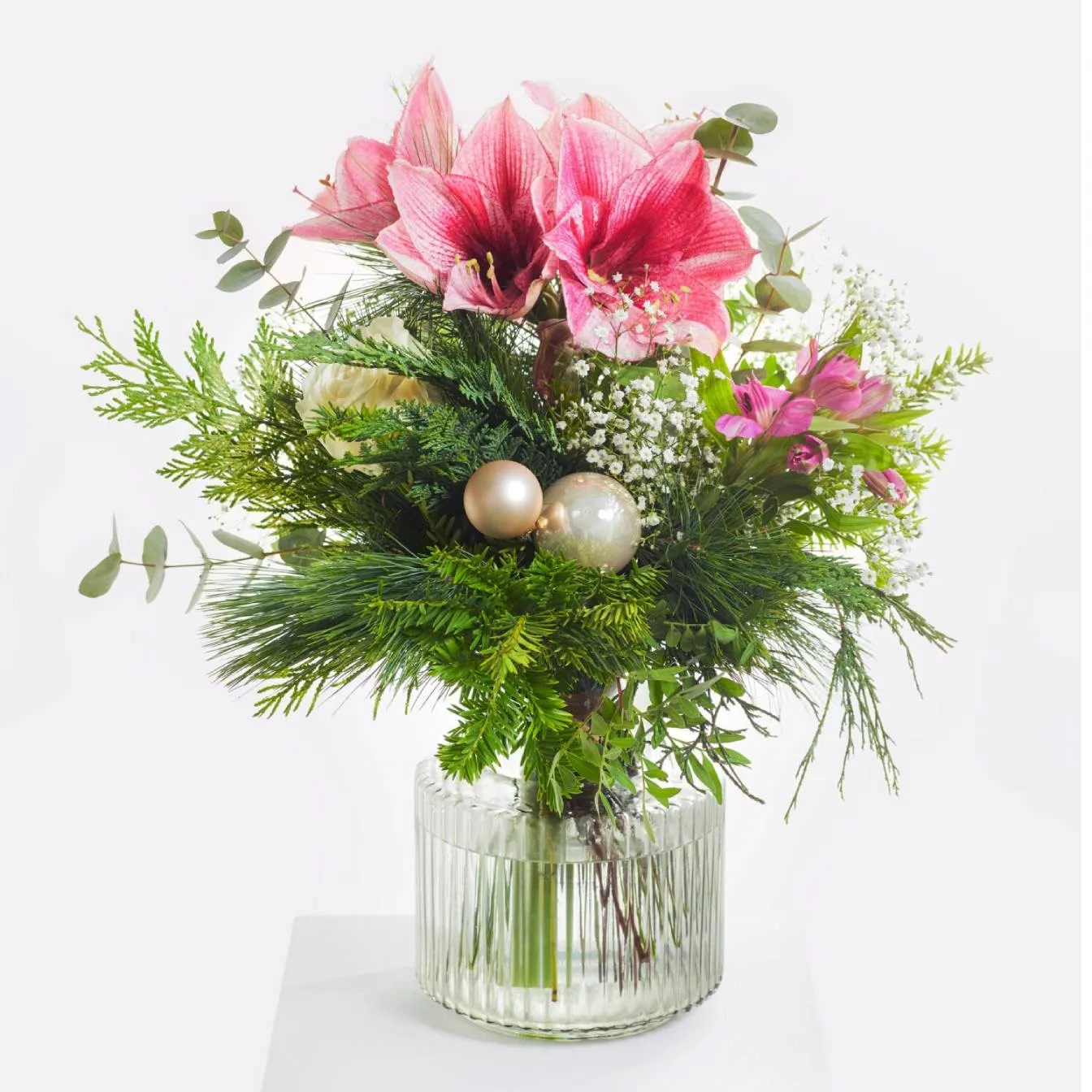 Okrągły ręcznie wiązany bukiet w kolorze różowym i białym z amarylisem, różami, alstromerią i oddechem dziecka oraz perłowymi szklanymi bombkami jako dodatkami, a także jedwabną sosną, eukaliptusem, iglakiem i pistacją.