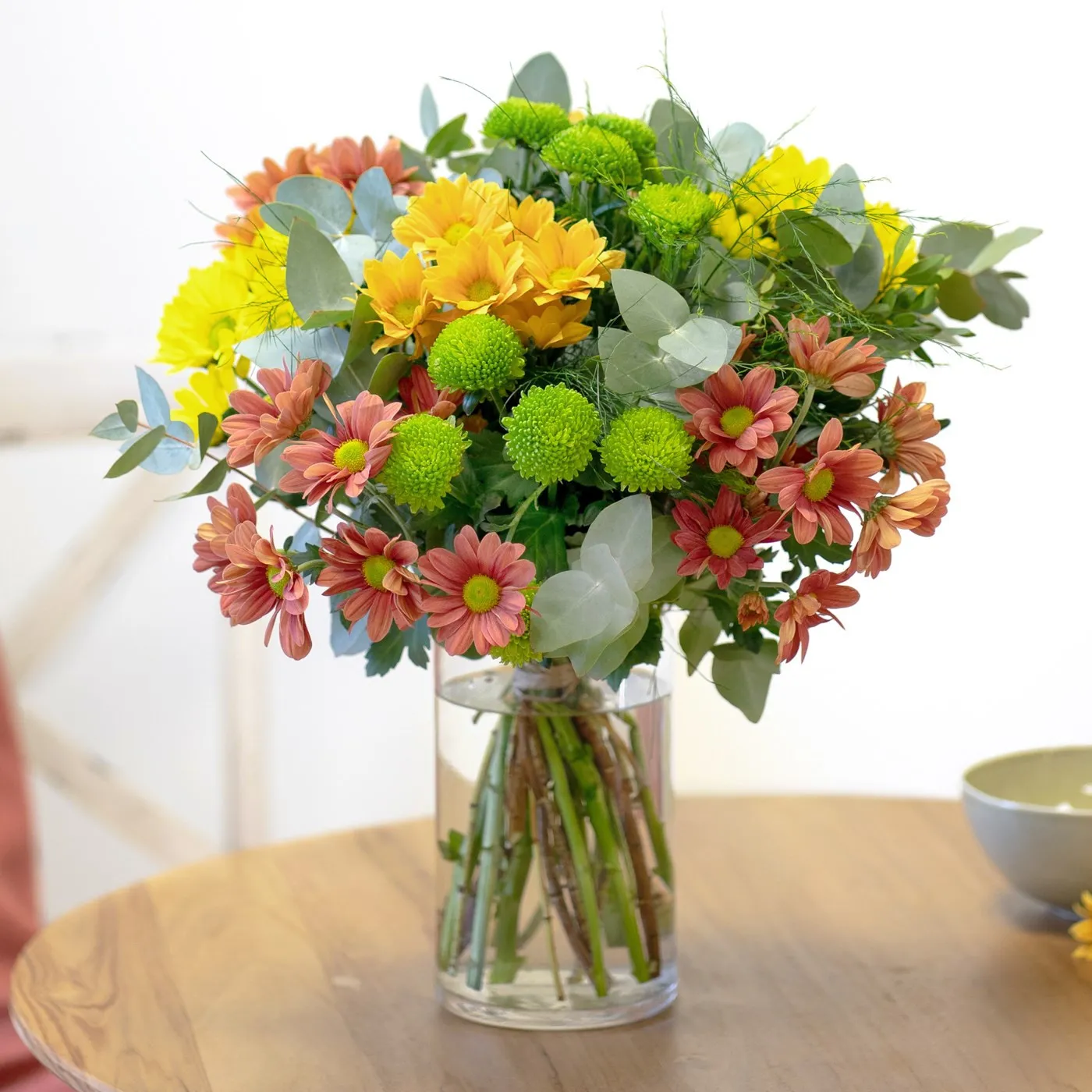 Bouquet of coloured daisies and decorative greenery