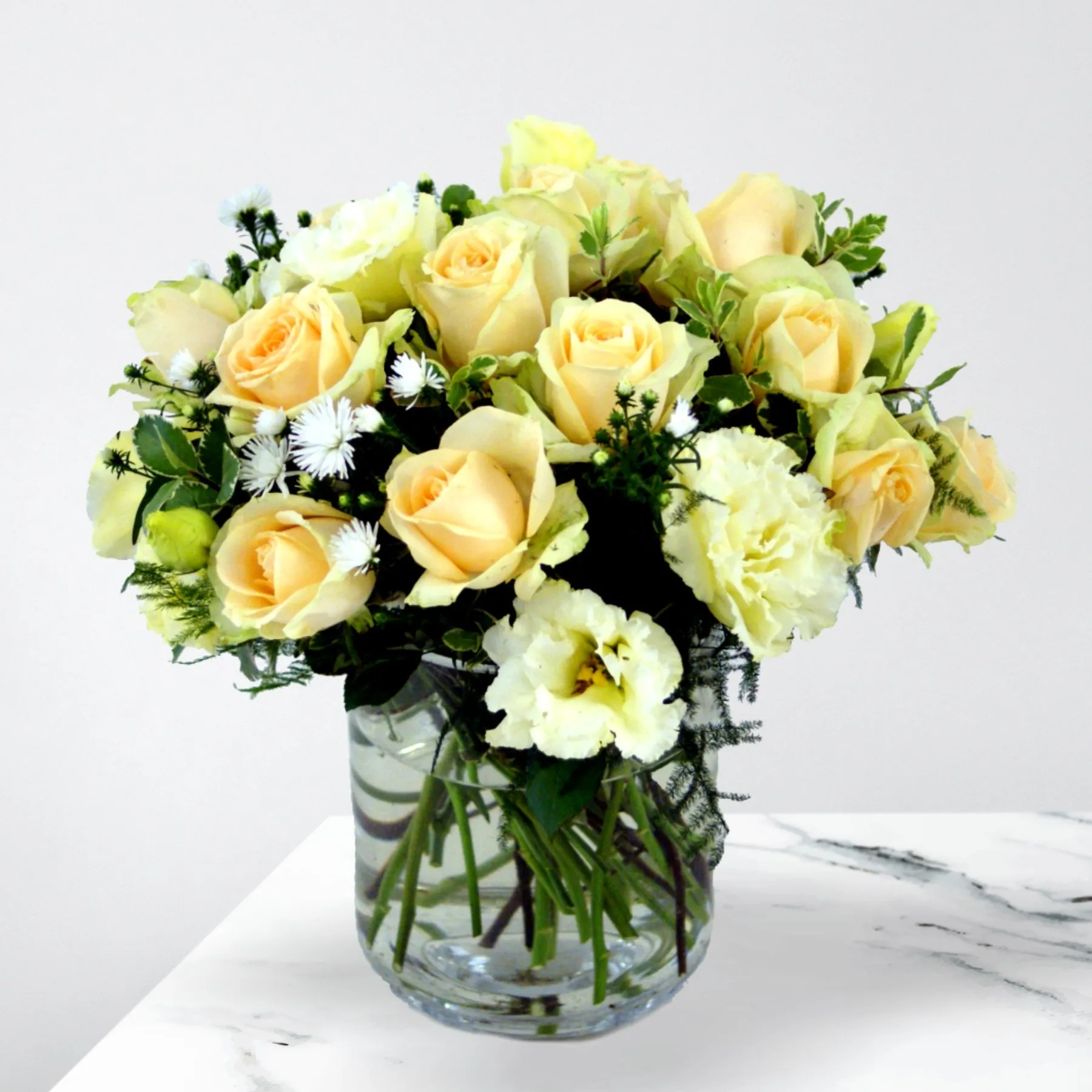 With a soothing yet bright palette of yellow or cream roses and lysianthus in a glass vase, Barbara will bring a ray of sunshine into any space. Delivered in a glass vase.