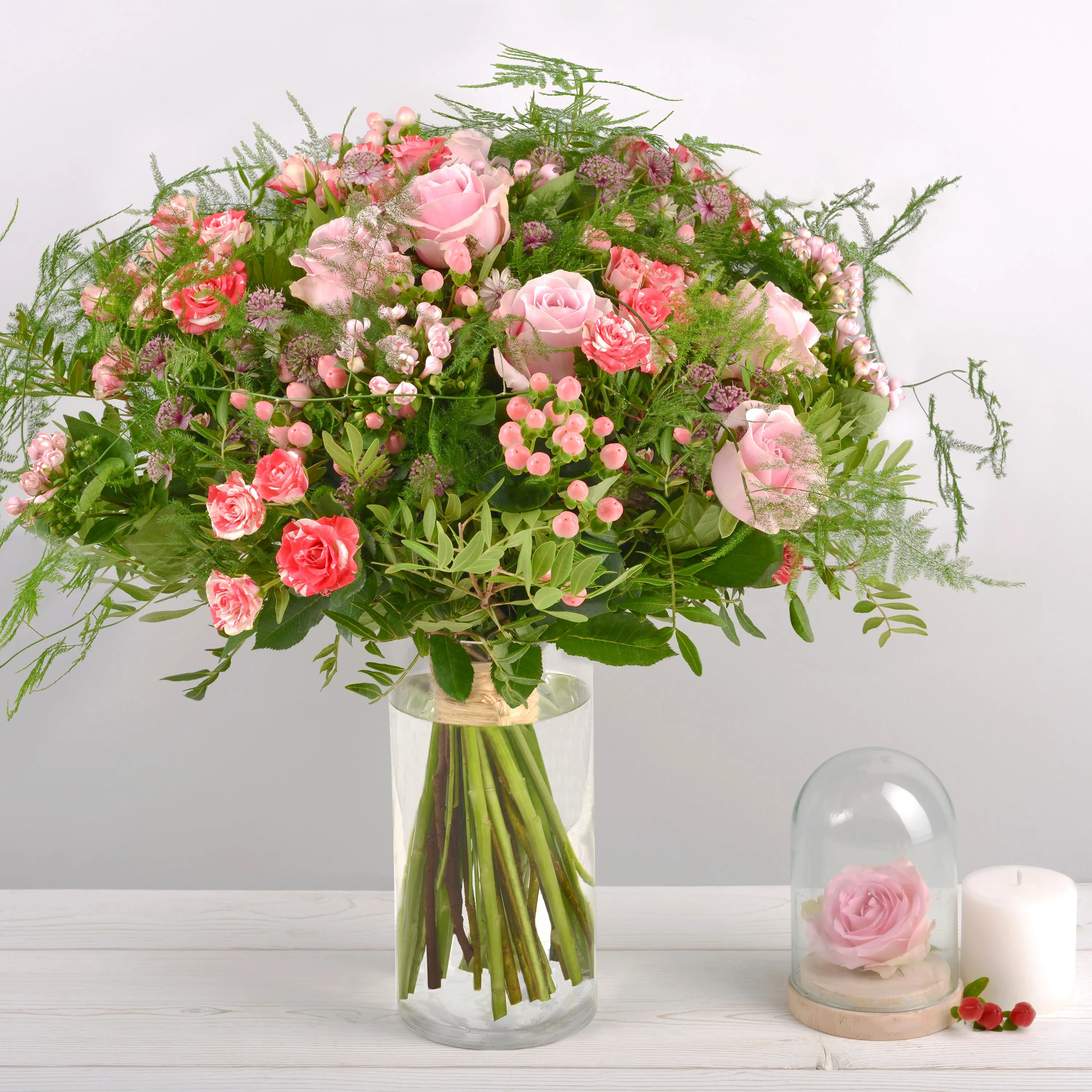 Rounded bouquet of various red, pink and raspberry flowers, with medium stems, with spray roses (or small buds), large rose buds and hypericum, enhanced with airy foliage