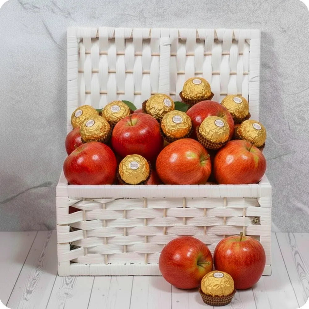 A box of apples and Ferrero Rocher is an elegant gift combining the natural freshness of fruit with the exquisite taste of chocolates. Carefully selected apples and pralines in gold packaging create a unique composition, ideal for a Christmas, birthday or corporate gift. The wooden box gives the whole a rustic charm, and its contents will delight both lovers of sweets and supporters of healthy gifts.