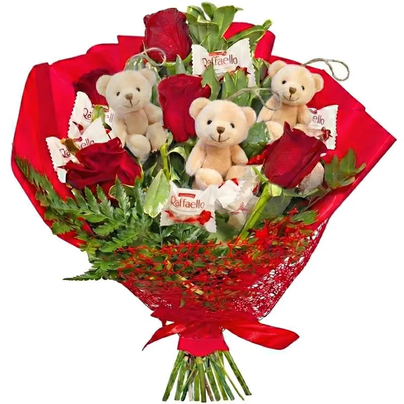 Among the roses you will also find three small teddy bears, which add charm and a few Raffaello pralines, thanks to which it is not only a bouquet of flowers, but a moment of sweetness.