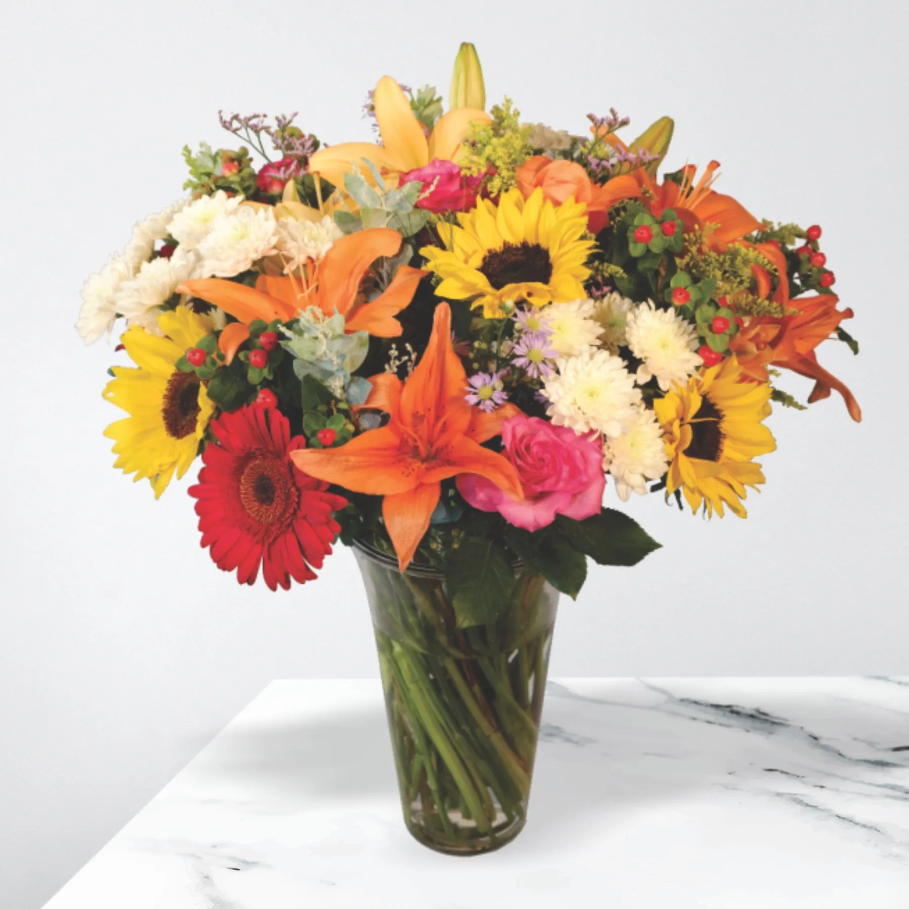 Carnival has the best mix of the season’s favorites including sunflowers, lilies, gerberas and more. Crafted by an expert florist, this arrangement has bold and beautiful colours that remind you of warm days and spending time with the ones you love. Delivered in a clear glass vase.