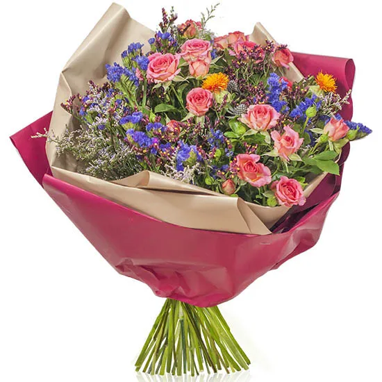 pink twig roses, limonium, thistle, decorative paper, ribbon