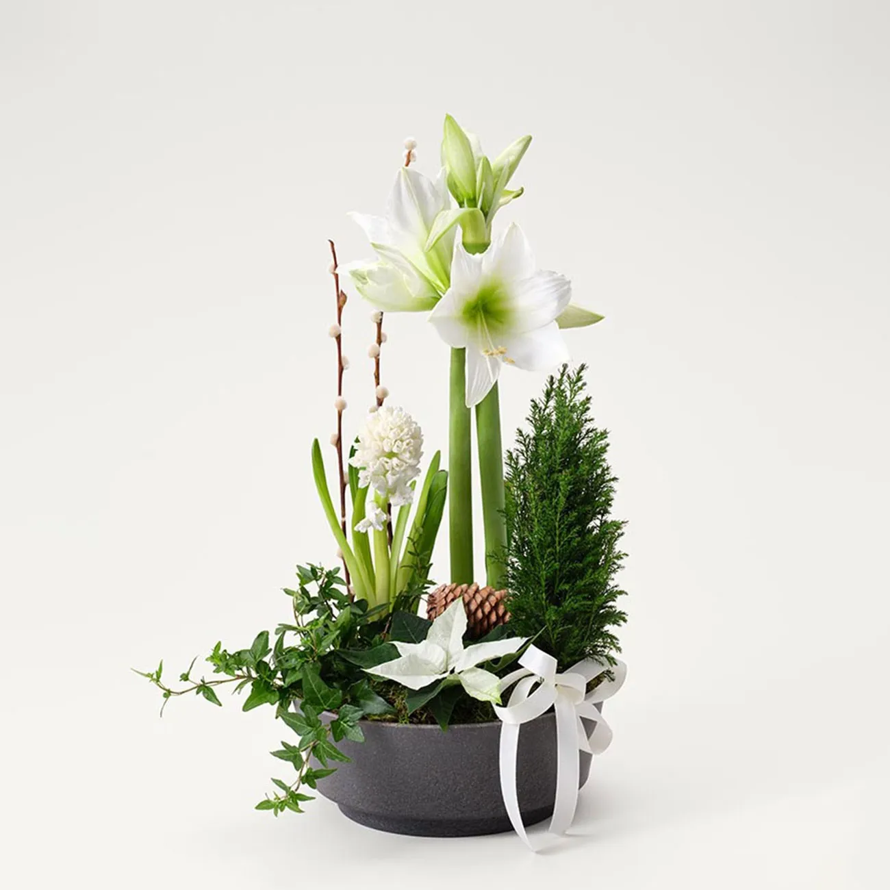 Enchant with a classic white Christmas arrangement of white amaryllis, hyacinth and mini star on a bed of festive greenery with cinnamon and pine cones. This white Christmas group really sets the Christmas mood!The amaryllis is delivered budded and a little shorter, but will grow and bloom beautifully.