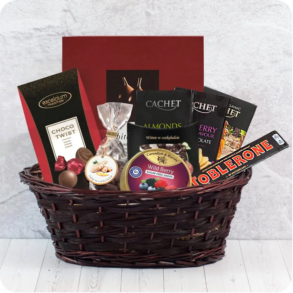 Does your loved one love chocolate? Do you like to try new flavours together with your loved ones? Poczta Kwiatowa® has introduced to its offer a gift basket Chocolate delight. It is a composition consisting of various products whose common feature is the presence of chocolate. The set includes an exclusive box of chocolate-covered figs, Cachet chocolates in various flavours, excellent chocolates sprinkled with raspberries, chocolate-covered cherries and ginger, and a Swiss Toblerone treat. Surprise chocolate lovers and give them a gift, full of delightful taste.