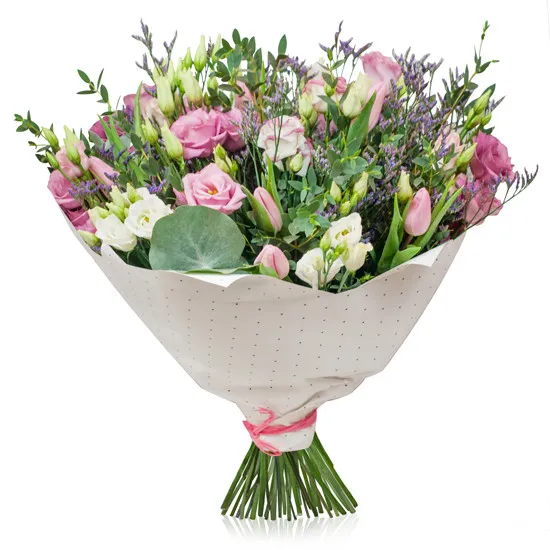 biała i różowa eustoma, fioletowe limonium, różowe tulipany, wstążka i papier dekoracyjny