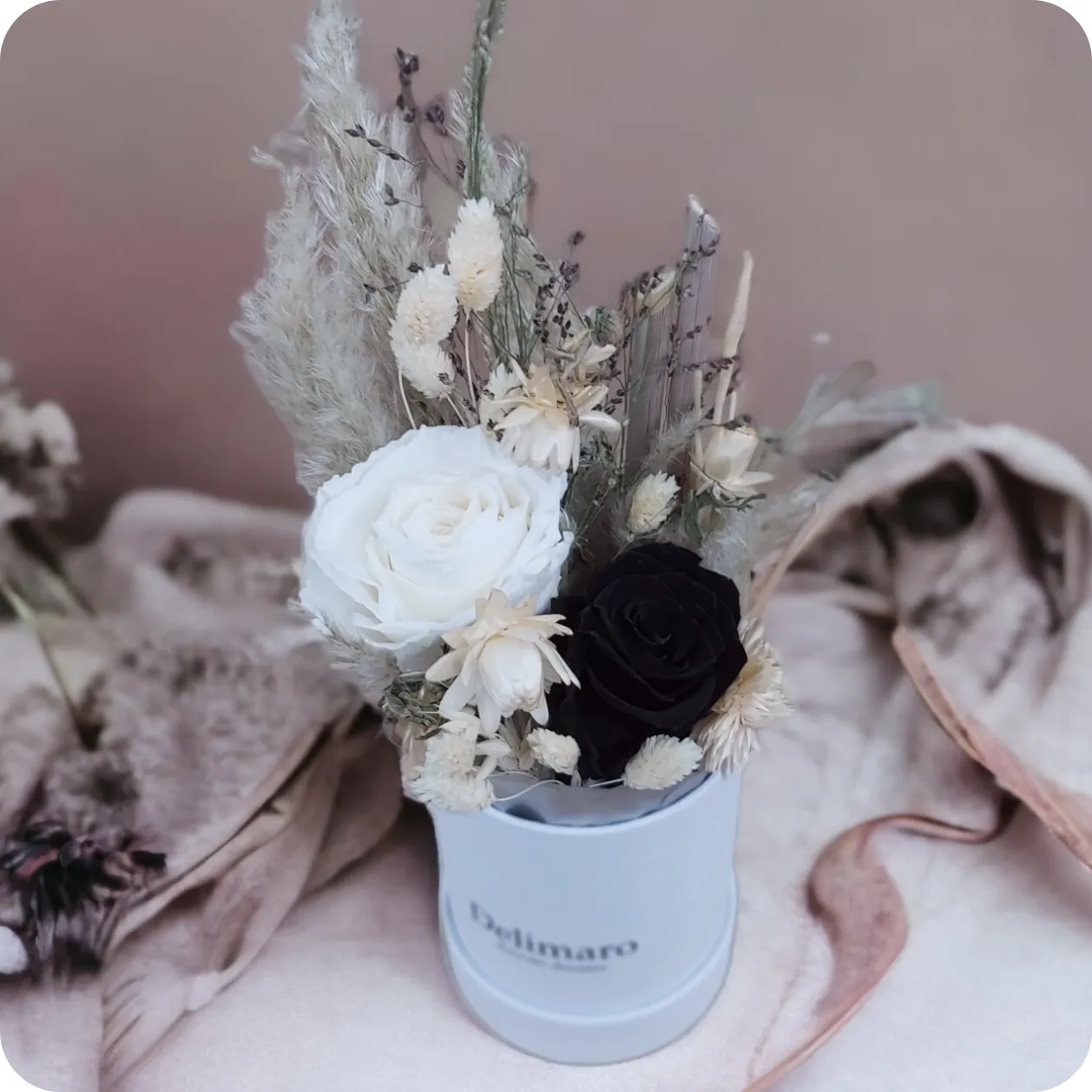 Bukiet z oferty regionalnej - Poczta Kwiatowa® WarszawaFlowerbox Najlepszy Duet to kompozycja, która celebruje harmonię kontrastu i piękno różnorodności. Ten Flowerbox zawiera suszone rośliny i zboże oraz dwie wieczne róże - jedną białą i jedną czarną, tworząc wyjątkowy i elegancki duet.Wieczne róże to nic innego jak żywe (ucięte) kwiaty, które zostały poddane specjalnemu procesowi utrwalającemu, dzięki któremu róże zachowują swój kształt i kolor przez 2 lata. Róże nie wymagają pielęgnacji.Flowerbox Najlepszy Duet to doskonały prezent na wiele okazji. Jest to wyraz miłości, kontrastu i harmonii, który przynosi urodę i elegancję. Ta kompozycja kwiatowa jest jak doskonały duet, który tworzy harmonię i piękno dzięki różnorodności. To także doskonały wybór na dekorację wnętrza, aby wniosła do domu cząstkę tajemnicy i trwałego piękna.