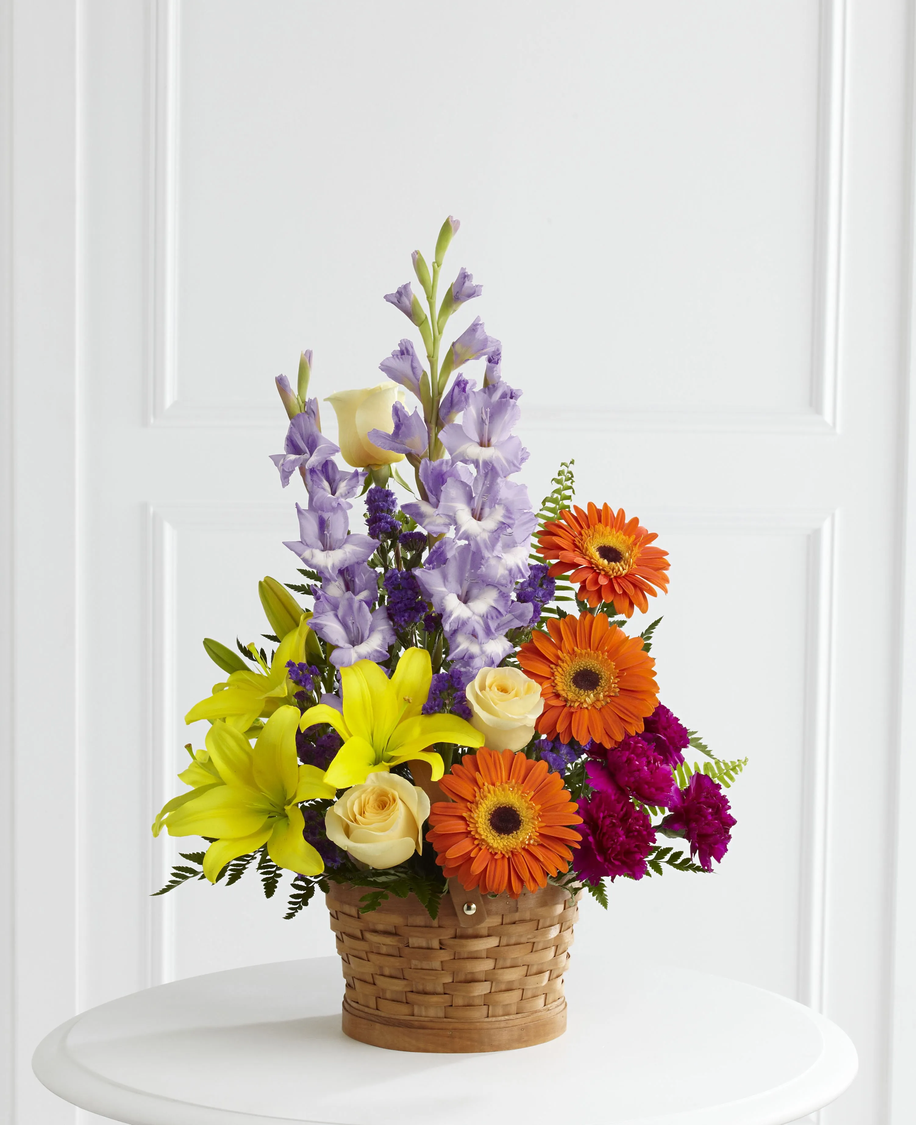 The Forever Dear Arrangement is a colorful assortment of flowers such as cream-colored roses, yellow Asiatic lilies, orange gerbera daisies, lavender gladiolus, plum carnations and purple statice, accented with assorted greens and displayed in a keepsake basket. (Flowers and basket may vary.) Fine flowers delivered in Venezuela.