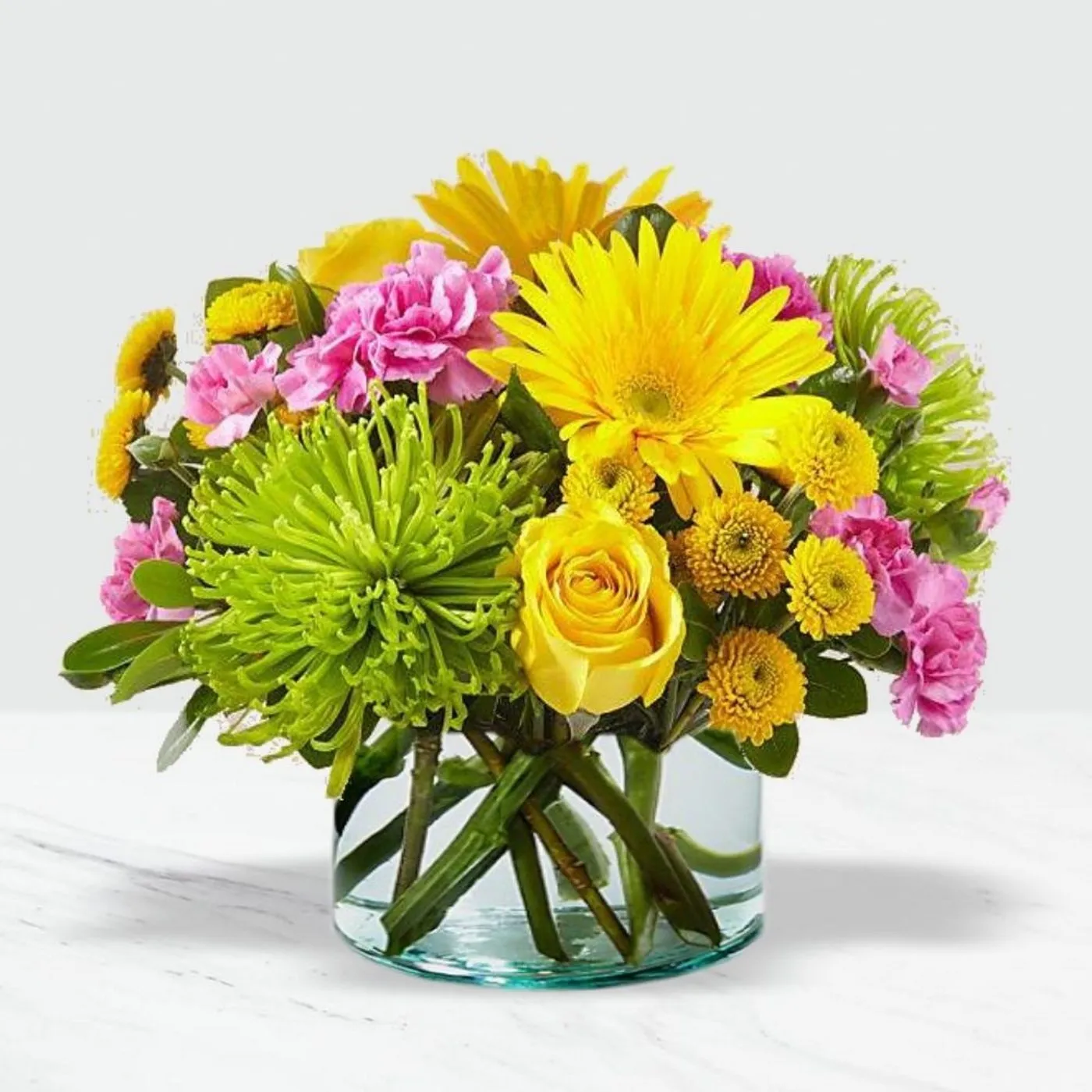 Overflowing with roses, carnations and crowd-pleasing gerbera daisies, this handcrafted bouquet puts the cherry on top of any celebration,