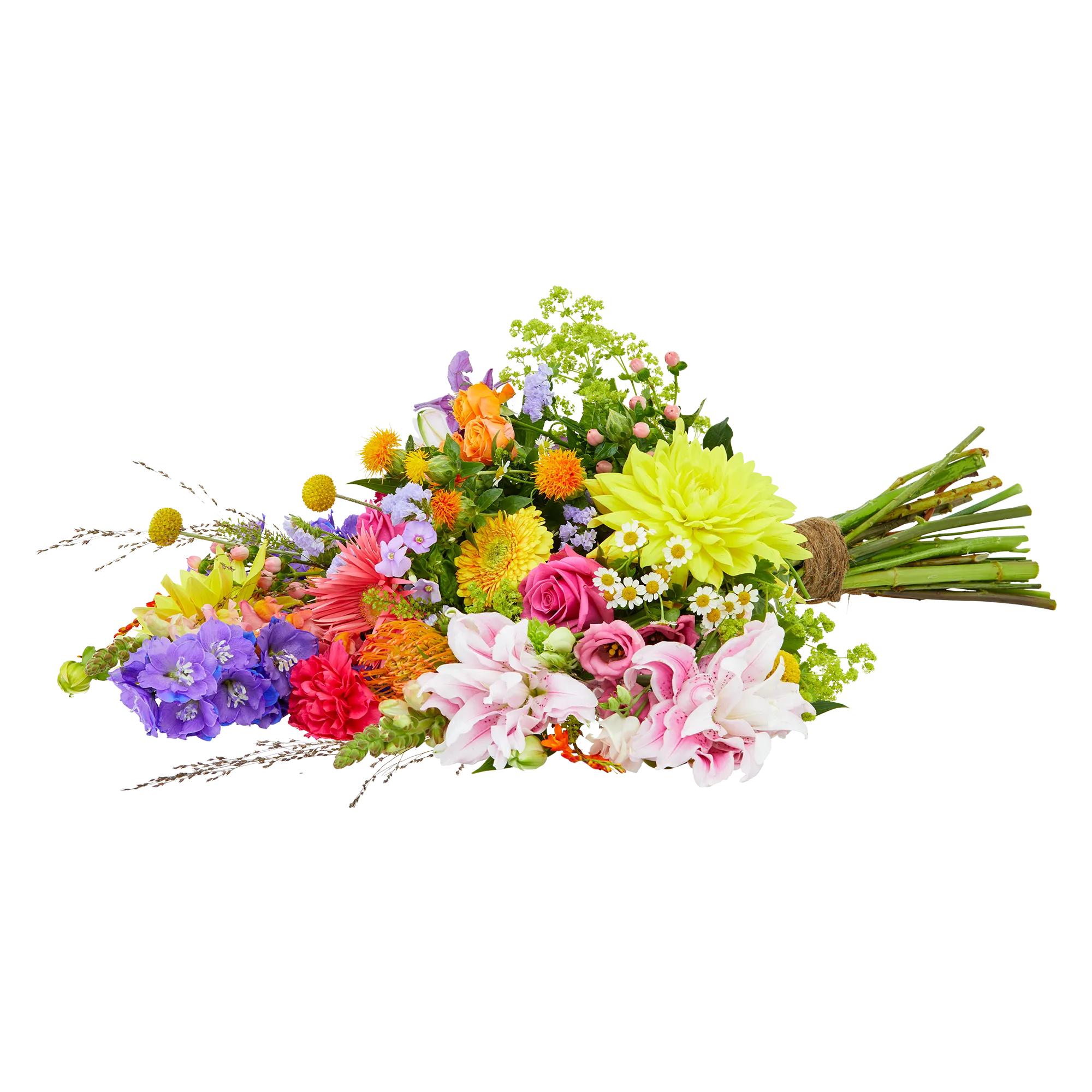 The funeral bouquet 'Colour splendor' is an airy and modern colourful funeral bouquet.
