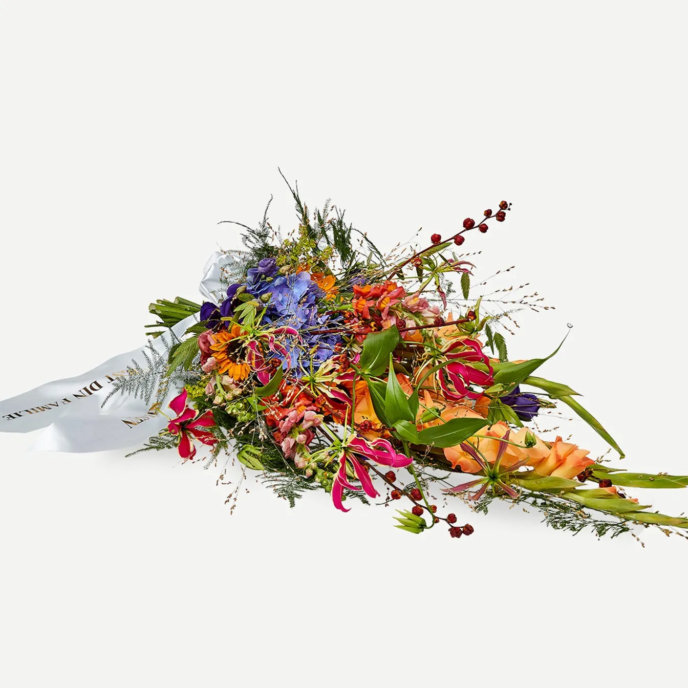 This funeral spray has a vibrant expression with a combination of orange, pink and purple tones. A beautiful last greeting for a colorful person.