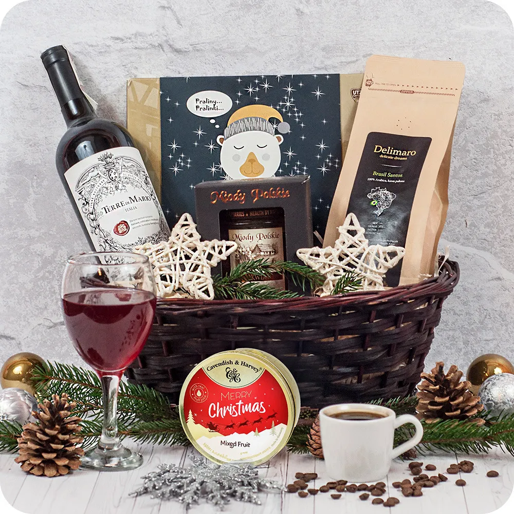 Christmas gift for the whole family, parents, or grandparents. Inside this beautiful package, you will find unique products that will bring back the most beautiful moments. This Christmas box with wine, coffee, and sweets is always good for a break time after a crazy day. In this holiday set, we put the best chocolate delights.Delimaro bean coffee. Dalimaro™ Eco Brasil is a premium coffee from the Santos plantation in Sao Paulo. Coffee with low acidity, mild taste, the aroma of light wooden notes. 100% Arabica. Packaging with a valve to ensure that the aroma is maintained. Terre di Mario Vino Rosso is a dry wine from Italy. Rich in blackberry and cherry aromas, will be perfect for roasts, pasta with meat, and grilled delicacies. The wine is very well-balanced and will delight many connoisseurs of this drink.A gift basket for Christmas is an original idea. In addition, we care about your convenience - all you need to do is order via the Internet and we will deliver it to the address you provide.Orders which are paid for before 12 o'clock will be delivered the next, working day. Orders within the borders of the city of Warsaw can be delivered the same day, as long as they are confirmed over the phone.Orders are fulfilled within 24 hours.
