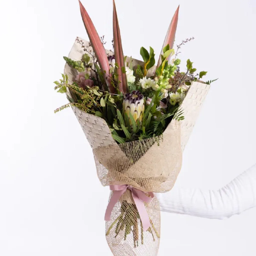 Harakeke Bouquet a stunning tribute to New Zealand’s native greenery and flora, skillfully crafted by an Interflora florist and wrapped in a flax mat. Crafted with soft pastel flowers and native greenery. Whether you're celebrating a milestone, expressing gratitude, or simply brightening someone’s day, the Harakeke Bouquet adds a touch of natural beauty and heartfelt recognition to every moment.