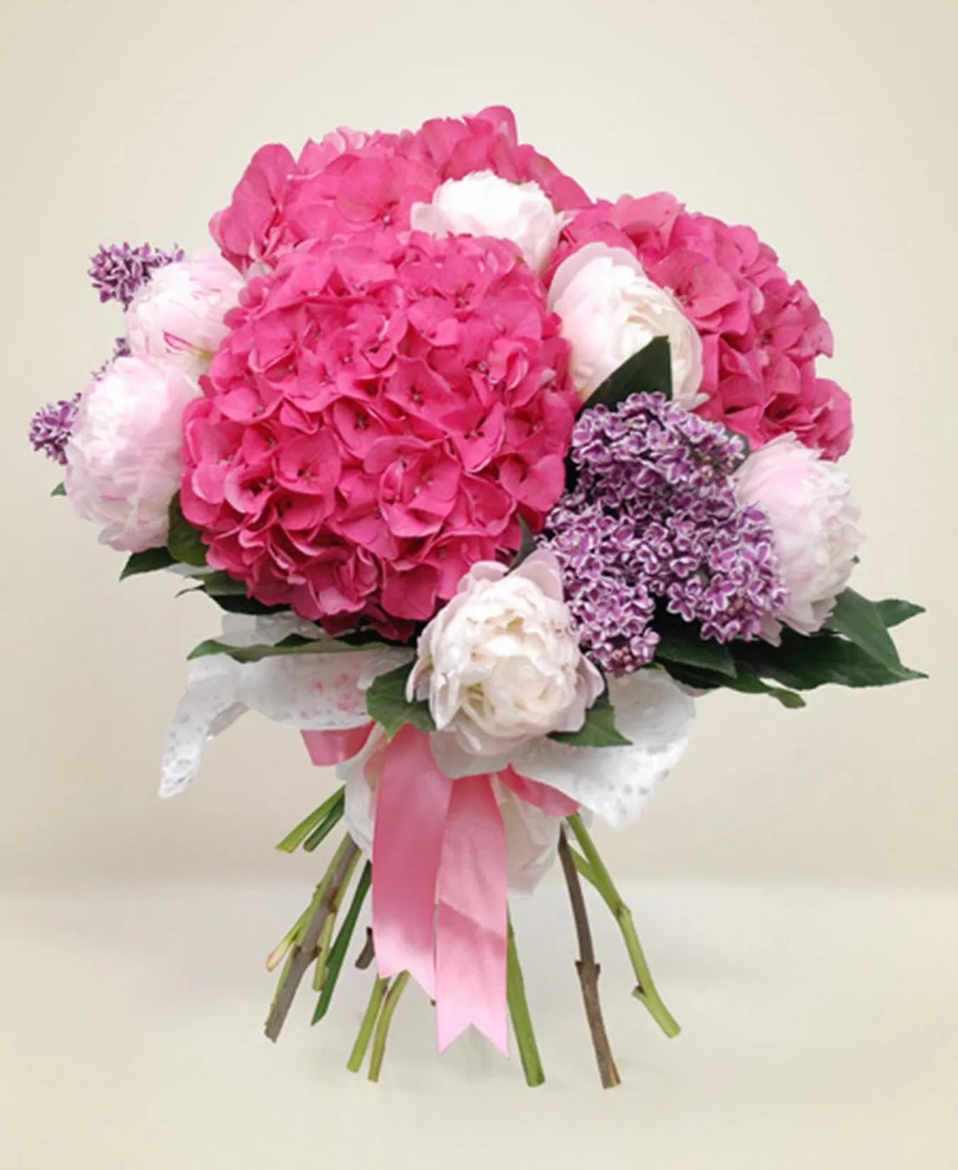 Flower bouquet of 3 hydrangeas, 11 peonies, 3 lilacs and exotic leaves.