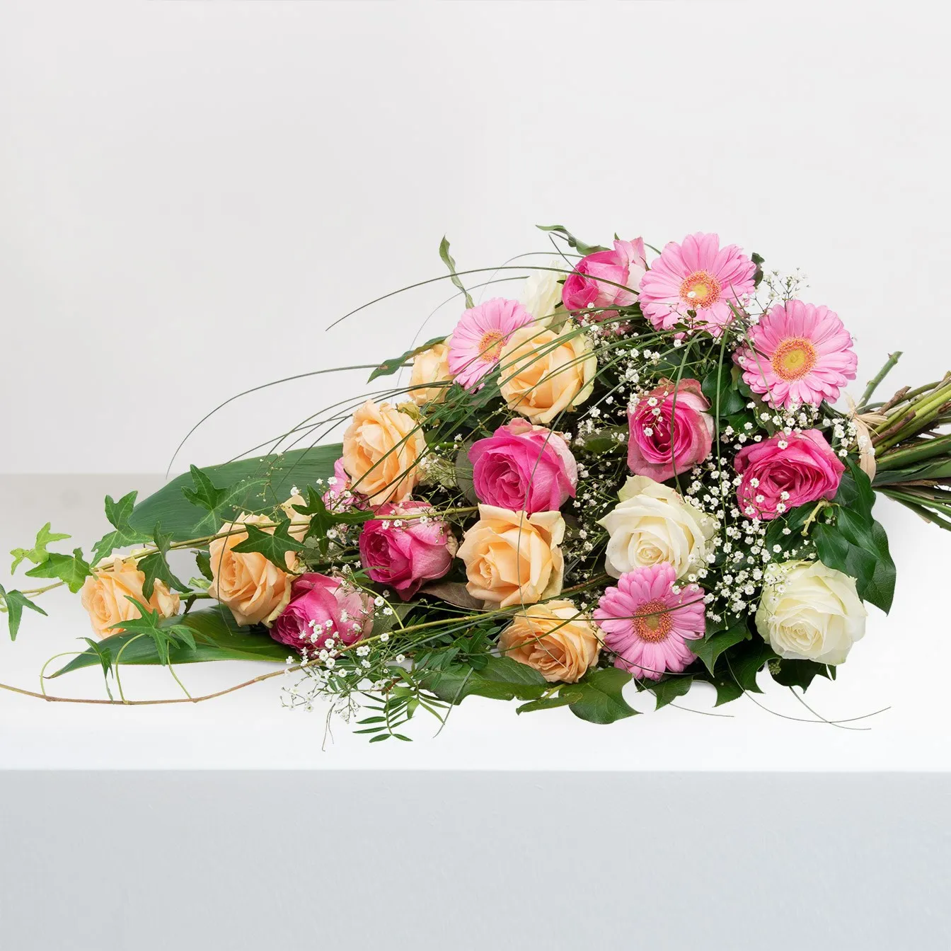 Hand-tied funeral bouquet in pink-apricot with white accents with roses, germini and gypsophila. Pistachio, shallon, ivy, xerophyllum and cordyline is used as decorative greenery.