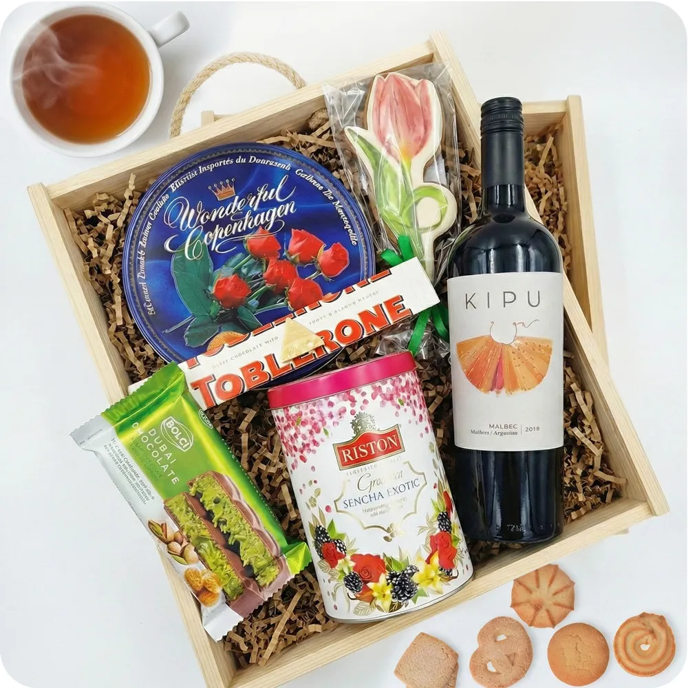 Give your loved one a unique gift full of taste and class. The Women's Kit is a carefully composed collection of elegant sweets, aromatic tea and dry wine, enclosed in a stylish wooden box. It's the perfect gift for women who value special moments with a glass of wine and sweet treats.