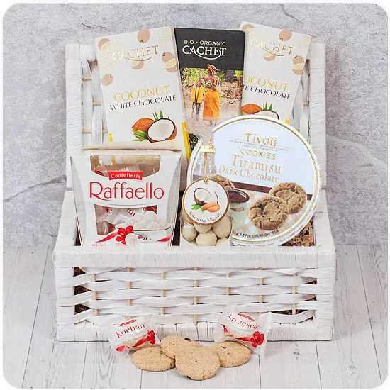 A successful gift idea? Poczta Kwiatowa® has the perfect answer! Opt for the Coconut Box gift basket! It is a tasteful gift for any formal or informal occasion. The recipient will find the highest quality sweets in the form of crunchy cookies, white and dark chocolate, coconut almonds or well-known Rafaello chocolates. Each of the ingredients have been composed so that not only the taste but also the appearance tempted and delighted.