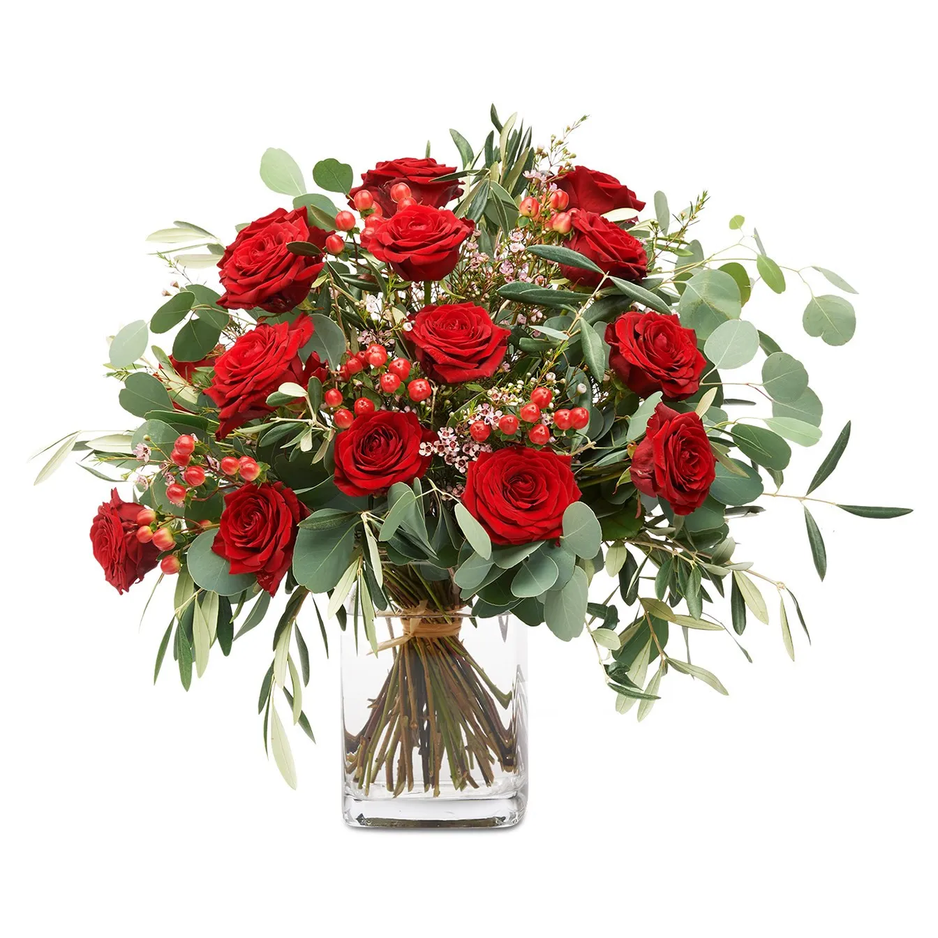 Large-blossom red roses complemented by hypericum, eucalyptus and other magnificent greenery are a matter of heart of all elegant ladies. Delight your loved one on Valentine's Day! Due to varied availability of flowers, we recommend to order this product at least 2 days before the intended delivery date. Vase is not included.
