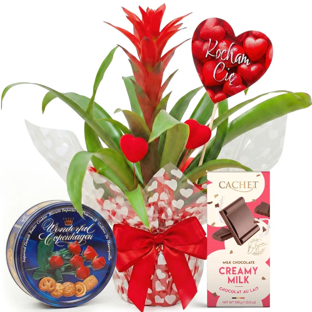 The Love Guzmania with Treats is an unusual combination of nature and sweetness that makes a magical gift for a loved one. This elegant guzmania potted plant has been decorated with red papier-mâché and adorable hearts, bringing a romantic atmosphere. The guzmania, with its distinctive inflorescences, not only adds to the charm of the plant to its surroundings, but also symbolises the permanence of feelings. The red papier-mâché emphasises the theme of love, while the hearts add subtlety and delicacy to the whole composition. But the highlights don't stop there! The Love Guzmania with Treats also provides culinary delights. The set includes delicious cakes whose crunchiness and flavour are sure to please the palate. In addition, the white chocolate with raspberry Cachet is a sweet feast for chocolate lovers, which pairs perfectly with the floral elegance of the guzmania. More than just a floral touch, this complete gift is a sophisticated combination of nature and gourmet pleasure. Ideal for Valentine's Day, an anniversary or simply as an expression of special care and love. Love Guzmania with delicacies is a magical composition that will bring joy to both the eyes and the palate.