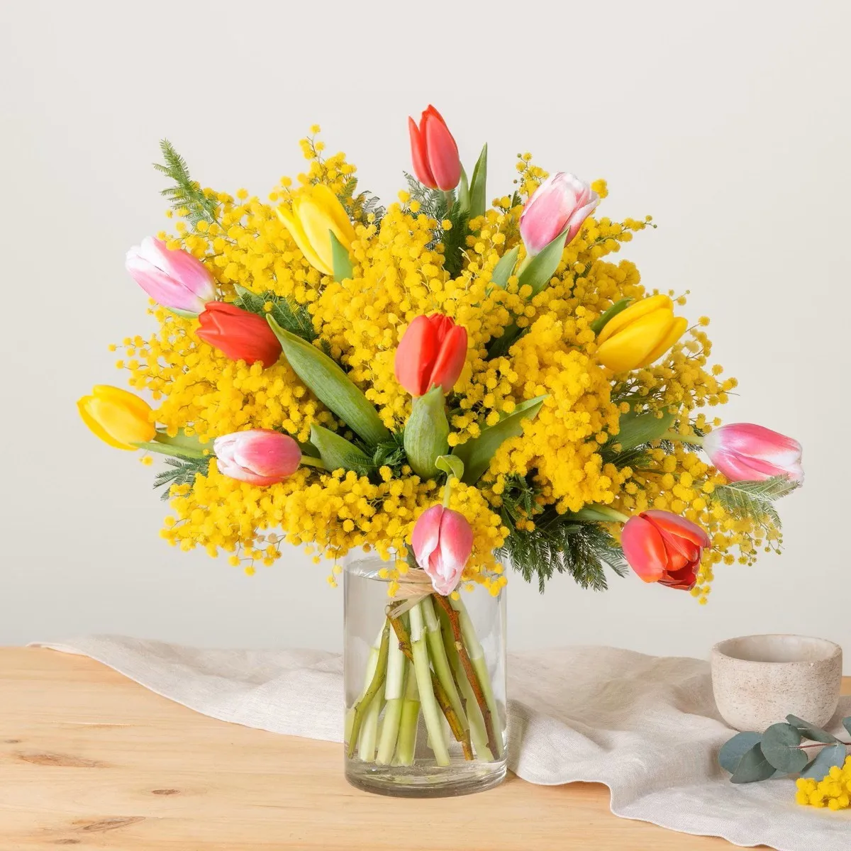 The queen of the bouquet: Mimosa and TulipThis radiant mimosa and tulip bouquet is a celebration of light and joy. With its combination of golden and vibrant tones, it is the perfect gift to brighten up any space and fill the atmosphere with warmth and optimism.Energy and Meaning: The mimosa, with its delicate golden spheres, symbolises friendship, gratitude and resilience, while the tulips represent love, admiration and renewal. Together, they create a message of sincere appreciation and hope. History and Tradition: The mimosa has been a symbol of strength and femininity, especially in celebrations such as International Women's Day. Tulips, with their origins in exotic Ottoman gardens, are emblematic of beauty and elegance around the world.A Burst of Colour: This bouquet is ideal for conveying joy and optimism. Its combination of gold and vibrant tones makes it perfect for special celebrations, thank you gifts or simply to brighten up a special someone's day.